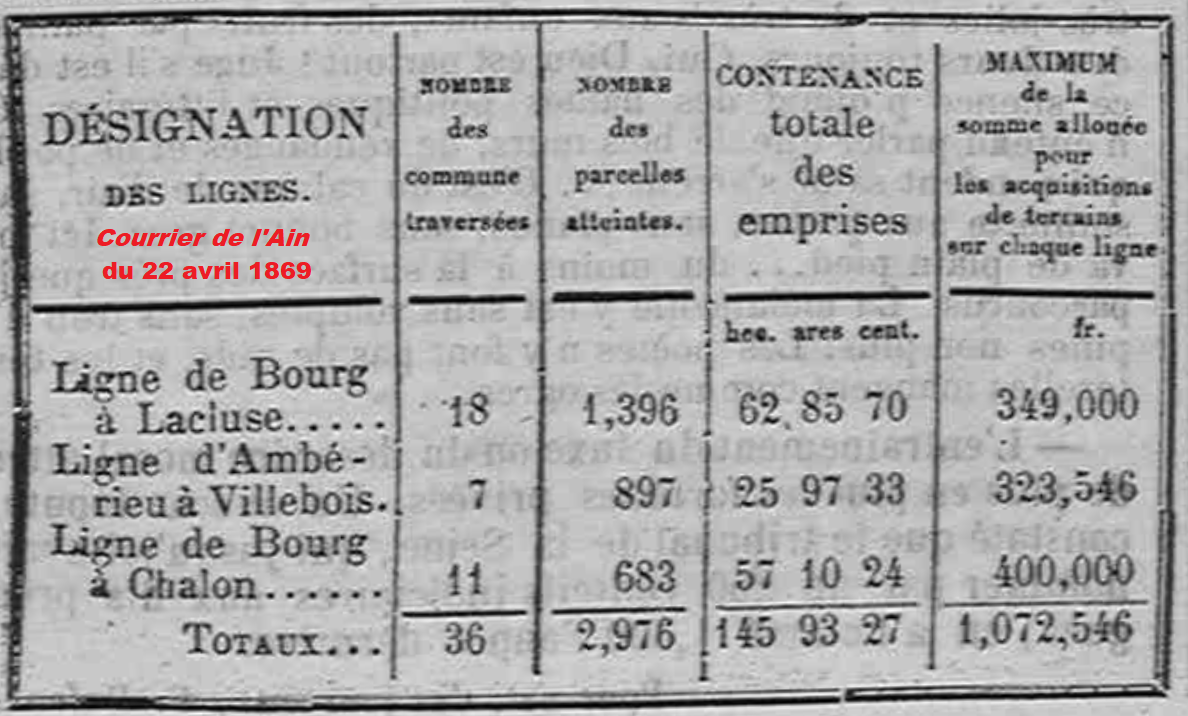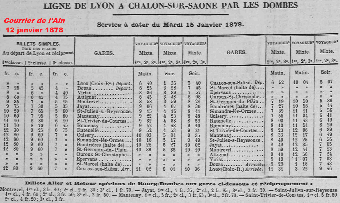 La ligne rejoindra, à Saint-Germain-du-Plain, celle de Chalon-sur-Saône à Lons-le-Saunier, également en projet pour la Compagnie de la Dombes. Les communes de l’Ain, qui ont voté leur participation, sont Saint-Trivier-de-Courtes (17 000 F), Curciat-Dongalon (5 000 F), Saint-Nizier-le-Bouchoux (4 000 F), Courtes (2 000 F), Vernoux (1 000 F), Vescours (500 F), Mantenay (1 500 F), Servignat (500 F), Saint-Julien-sur-Reyssouze (8 500 F), Lescheroux (2 000 F), Saint-Jean-sur-Reyssouze (6 000 F), Jayat (4 000 F), Béreyziat [7] (1 000 F), Foissiat (5 000 F d’imposition + 116 F de fonds libres), Montrevel (10 000 F), Étrez (1 000 F), Malafretaz (1 500 F), Marsonnas (2 500 F), Saint-Didier-d’Aussiat (1 500 F), Saint-Martin-le-Châtel (500 F), Cras (5 000 F), Viriat (3 000 F), Confrançon (500 F), Curtafond (500 F) et Bourg (13 000 F) [8]. Le député Léopold Le Hon ajoute 2 884 francs et les 100 000 francs nécessaires sont atteints. La commune d’Attignat ne figure pas sur cette liste initiale mais votera 5 000 francs, plus tard [9].