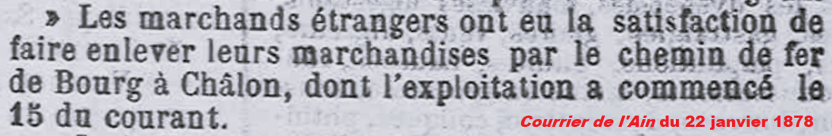Dès sa mise en service, la ligne est au service de l’agriculture comme le prouvent ces deux échos du Courrier de l’Ain. La foire de Montrevel de mi-janvier, dite de Saint-Antoine, est l’une des foires grasses les plus importantes de la région pour le commerce des porcs [27].