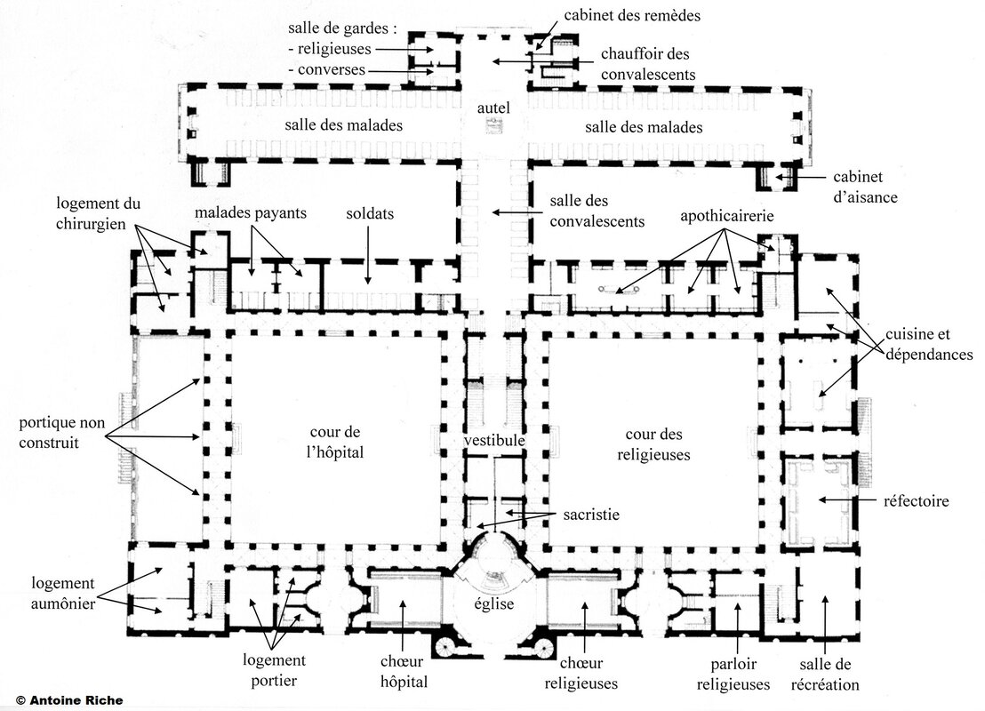 Les salles des malades, superposées, ont une grande élévation pour favoriser leur aération et sont conçues en demi-étage pour limiter les fatigues de déplacement. L’apothicairerie, source de revenus, est bien accessible au public même si son accès se fait par la salle des convalescents. Cela peut inspirer de la compassion et des dons.
