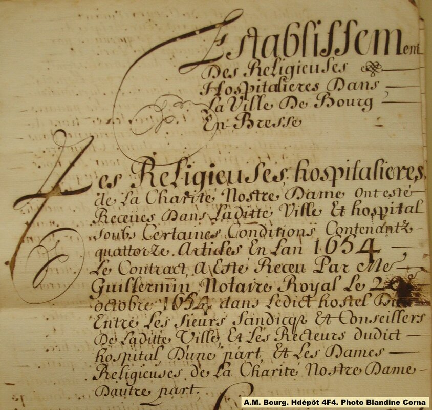 La convention, comme il est d’usage, est passée devant un notaire le 29 octobre 1654. Elle prévoit que les religieuses « prennent et se chargent à perpétuité du régime des pauvres dudit hospital de Bourg, vivant religieusement suivant leur règle de Saint-Augustin (…) Que lesdites religieuses seront nourries et entretenues aux dépens dudit hospital et s’emploieront au ministère et service d’iceluy, traitteront, panseront et médicamenteront en personne les femmes malades dans une des dites deux salles ou chambres et feront traitter, panser et médicamenter la salle et chambre des hommes par des hommes ou femmes séculiers qu’elles choisiront au nombre qui sera jugé nécessaire, tant par elles que par lesdits sieurs syndics et recteurs ». De nombreux points sont évoqués dont « une boutique pour l’apothicairerie ». Les comptes sont alors présentés par la supérieure des hospitalières (jusqu’en 1699).