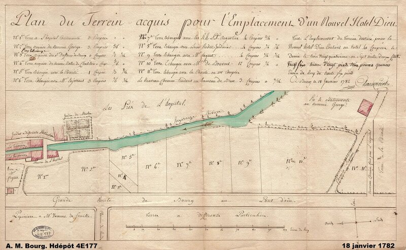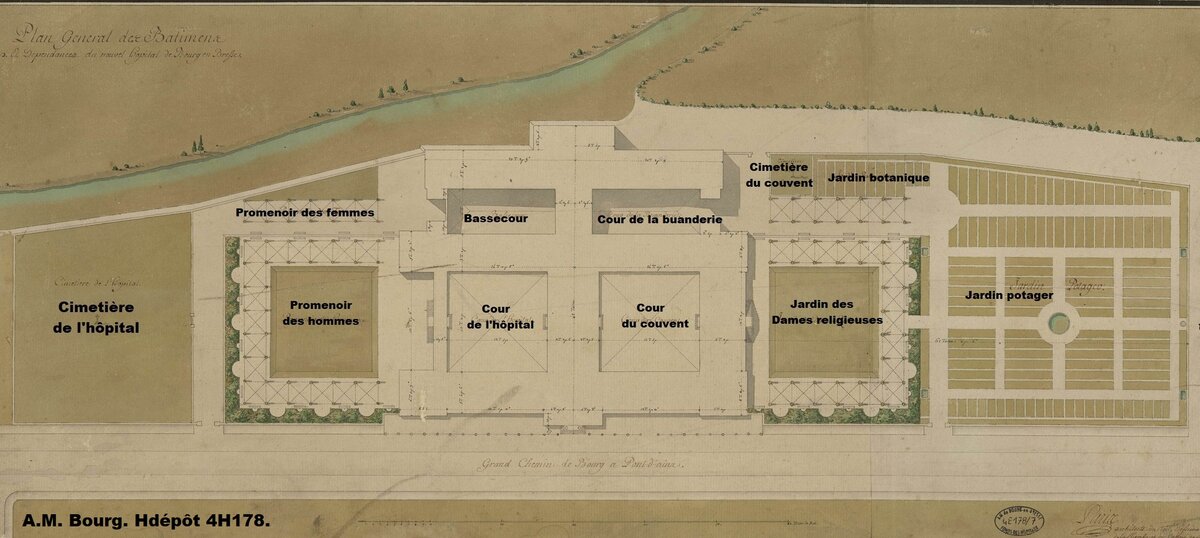 L’Hôtel-Dieu, à l’étroit dans ses locaux au cœur de la ville, ne permet pas d’apporter des soins appropriés aux malades. En 1774, l’idée de réunir l’hôpital et la Charité est lancée mais les clauses de fondation de cette dernière interdisent une telle fusion. Un terrain a été envisagé à Brou, entre la Reyssouze et la route de Pont-d’Ain, en dehors de la ville. Le projet de déplacer l’hôpital est néanmoins retenu et poursuivi même si la ville construit beaucoup à cette période. L’hôpital dispose de fonds et il relance ses débiteurs.