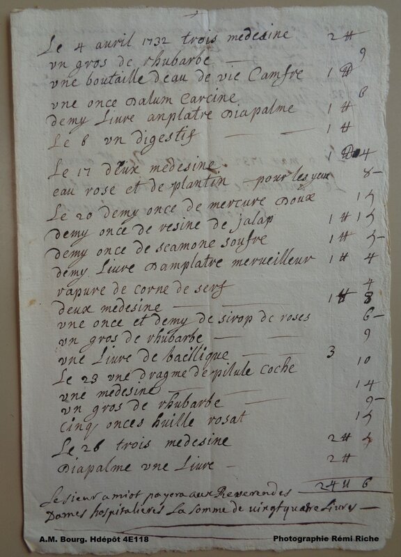 Auparavant, en 1751, les administrateurs avaient décidé de fournir au personnel médical des instruments plus appropriés et avaient demandé à l’astronome Lalande de les acheter à Paris. Il ne s’acquitte de sa tâche qu’en 1756. Comme dans tous les hôpitaux de France, les dépenses de médicaments sont peu élevées. Le premier achat de thériaque, panacée universelle, date de 1681 et celui de quinquina de 1689. Les religieuses de l’apothicairerie demandent un laboratoire en 1708. Des personnes pieuses achètent en 1735, au nom des pauvres, un domaine aux Mangettes (paroisse de Saint-Étienne-du-Bois), pour que les revenus soient affectés à la pharmacie.