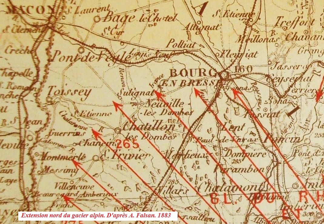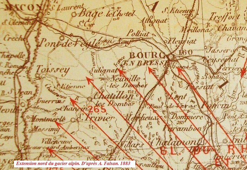 FALSAN Albert. Esquisse géologique du terrain erratique et des anciens glaciers de la région centrale du Rhône. 1883. (A.D. Ain BIB D 404).