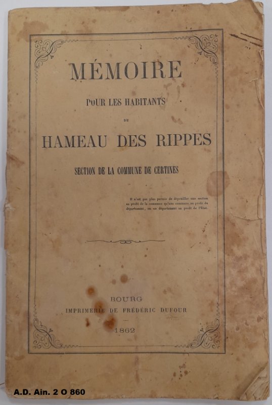 La Communauté des Rippes, telle qu’elle se définit dans un mémoire imprimé de 1862, a été rattachée aux paroisses de Montagnat puis de Tossiat dans les temps anciens. Dans l’organisation administrative née de la Révolution, elle est devenue une section de Certines, avec 82 maisons et 320 habitants. Bénéficiant de coupes de bois, elle revendique des équipements mais, le 12 septembre 1859, l’administration préfectorale répond ne voir « aucune utilité à construire, pour le hameau des Rippes, une chapelle et une maison d’école [3] ».