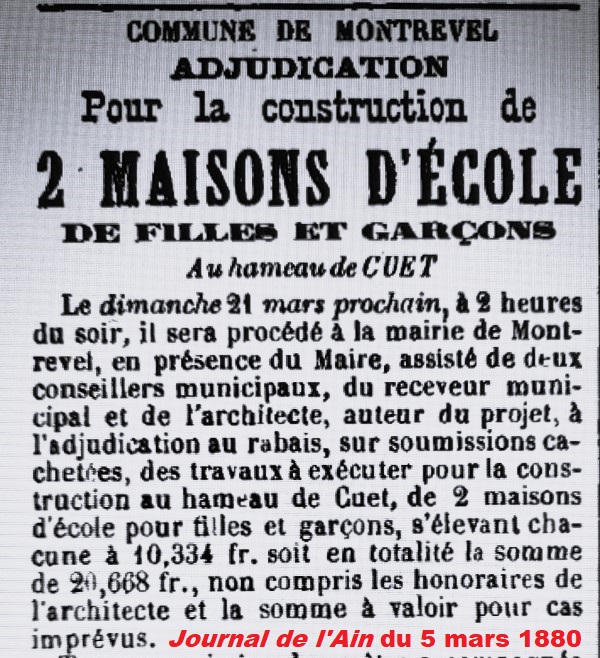 Quelques années plus tard, le 5 mai 1878, le Conseil municipal de Montrevel souhaite l’édification de deux écoles à Cuet. Il n’est pas rancunier car le hameau avait engagé une nouvelle procédure pour être érigé en commune. Après une forte mobilisation contraire des habitants de Montrevel lors de l’enquête préliminaire en juin 1873, le Conseil général de l’Ain refuse la demande le 21 octobre 1874, car « la séparation serait très fâcheuse pour la commune de Montrevel et la section de Cuet n’en retirerait aucun avantage sérieux. (…) Que les habitants de Cuet renoncent donc à vouloir changer l’état actuel des choses ; les griefs qu’ils invoquent ne sont pas fondés » ; une délibération validée par le ministère de l’Intérieur [8].
