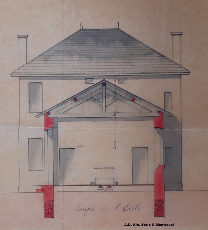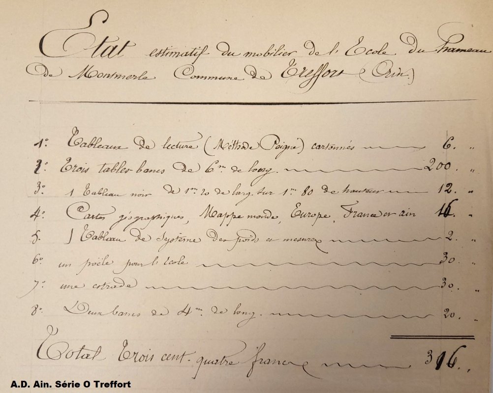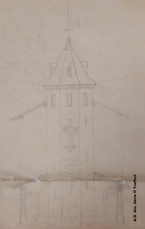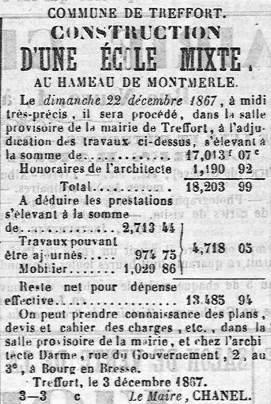 Même ayant reconnu « la nécessité de mieux installer l’école de Montmerle », le Conseil municipal du 12 août 1866 maintient sa position de « donner d’abord satisfaction aux besoins de Treffort lui-même et des hameaux de la Bresse ». Un avant-projet est néanmoins dressé par l’architecte Darme (de Bourg-en-Bresse) et, comme Montmerle « a une certaine importance comme population et centre industriel car on y exploite des carrières de pierre de taille », le préfet demande au ministère qu’une « subvention de 5 à 6 000 francs » lui soit accordée.