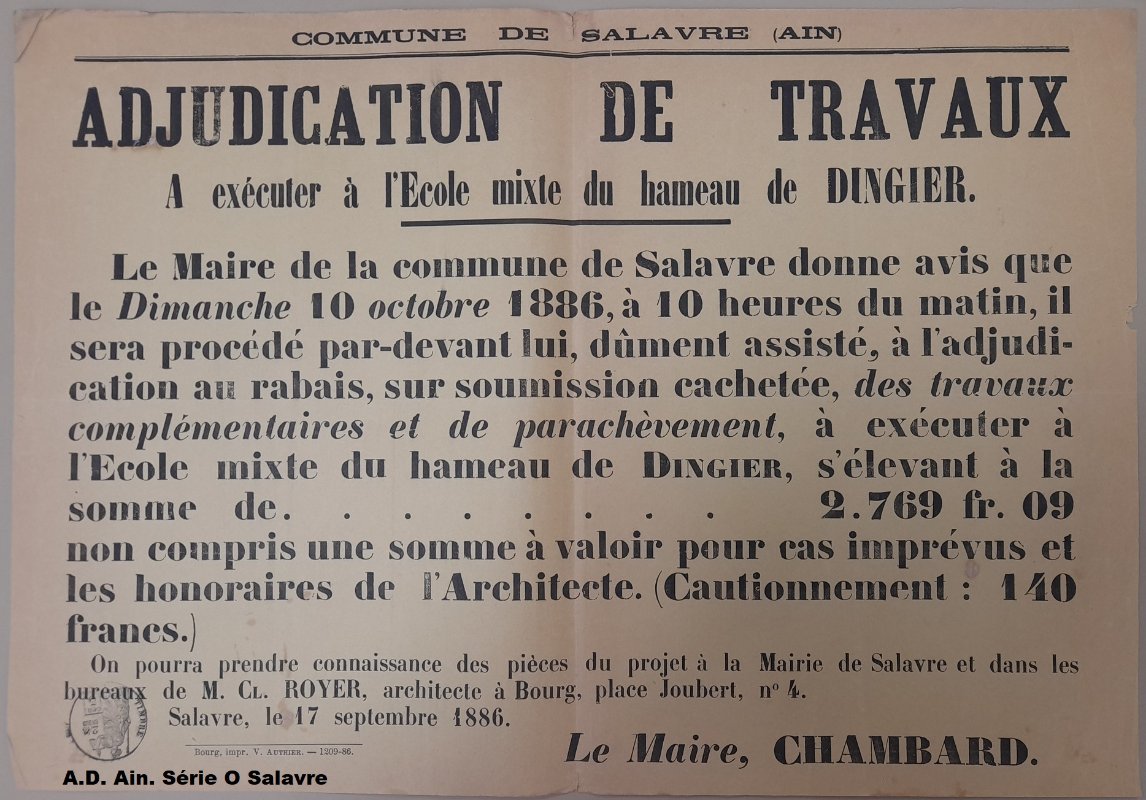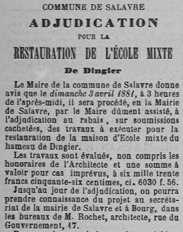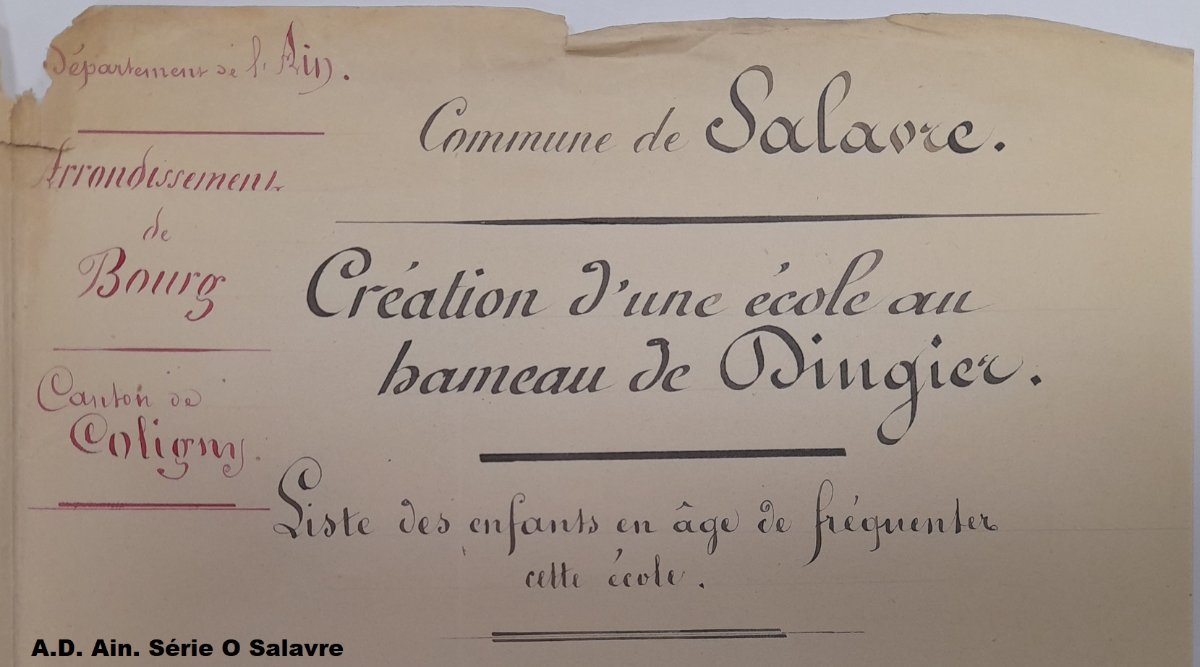 Le 20 novembre 1879, le Conseil municipal de Salavre accepte ce legs, qui s’élève à environ vingt mille francs. Après une visite sur place où 13 garçons et 11 filles peuvent être scolarisés, les services académiques ont instruit la demande de Dingier et une décision ministérielle du 24 novembre 1879 crée administrativement l’école de Dingier.