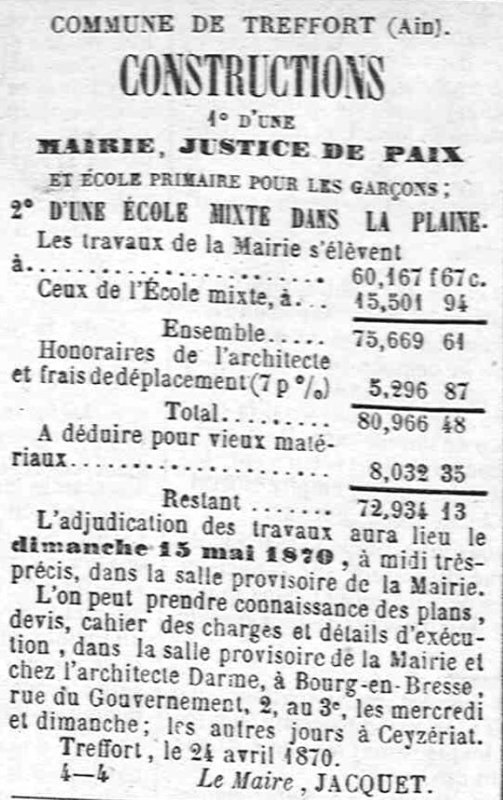 En outre, la commune, chef-lieu de canton, s’est donné d’autres priorités, comme la construction d’une nouvelle mairie car « Treffort, chef-lieu de canton, n’a ni salle de mairie, ni prétoire pour la justice de paix, ni logement pour l’instituteur ; il n’y a que l’ancienne salle d’école qui sert à toutes les réunions publiques, tirage au sort du conseil de révision, adjudications communales, etc, etc, aussi le mobilier de cette école est dans un piteux état ».