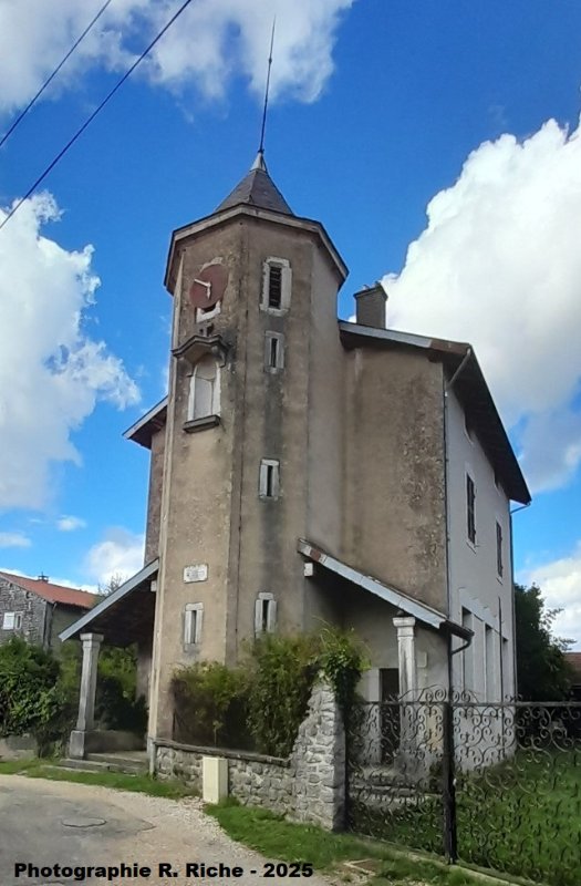 Après l’acceptation du devis le 9 mai 1867, le Conseil municipal acquiert le terrain et le ministère confirme la subvention obtenue en octobre Les travaux sont adjugés et le bâtiment s’achève en octobre 1868 [12]. La justification du "clocher" ne figure pas dans les dossiers des Archives départementales. Sur la façade, une plaque de marbre a été ajoutée en 1935 pour rappeler le don de « M. René Gérard, professeur honoraire ».