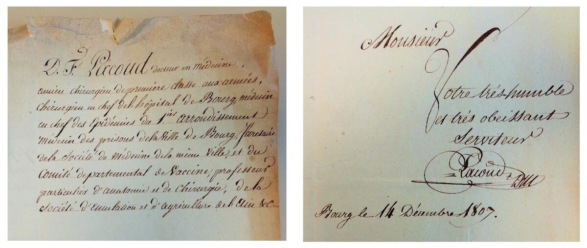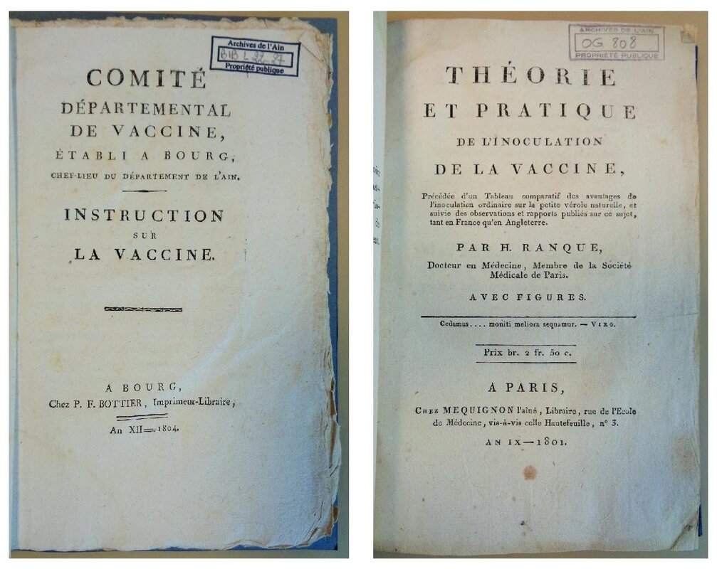Trois mois après Paris, la vaccination est appliquée dans l’Ain. « La première tentative fut faite à Bourg en brumaire an IX [23 octobre-21 novembre 1800] par le médecin Perret sur son fils auquel il avait quelque temps auparavant inoculé infructueusement la petite vérole. Cet exemple fut bientôt suivi, avec un égal succès, par les médecins les plus distingués du département et, dans le courant de l’an XI, il y eut plus de 400 enfants soumis à cette bénigne opération dans la seule ville de Bourg.