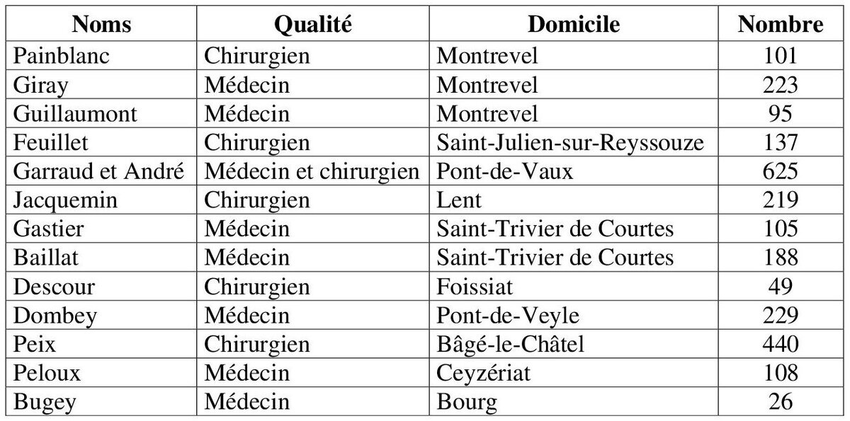 En titre, le Docteur Denis François Pacoud [10] est le médecin en chef pour les épidémies pour le seul arrondissement de Bourg. En réalité, il sollicite des rapports de ses confrères et en transmet les analyses au préfet. Durant l’an XIII, il fait un cours public de vaccine « pour 32 sages-femmes qui suivent, à Bourg, le cours d’accouchement établi d’après la loi sur l’organisation de la médecine et dont il était professeur-adjoint. (…) On apprend ensuite que quelques-unes ont inoculé la vaccine avec succès. (…) Après avoir écarté les dangers qui menacent les premiers jours de l’existence de l’homme, que peuvent-elles faire de plus utile pour lui que de le soustraire à la plus hideuse, à la plus meurtrière de toutes les maladies ».