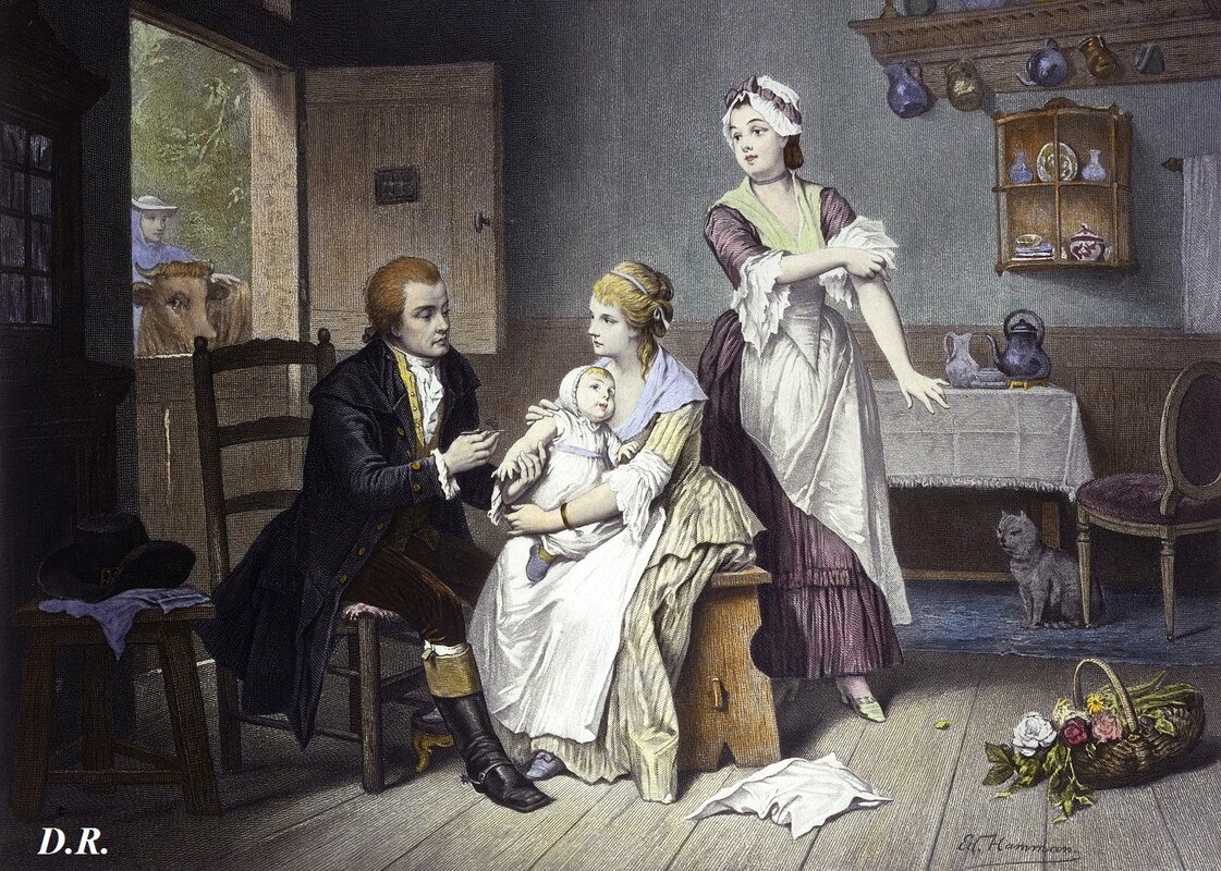 Le docteur Edward Jenner (1749-1823) effectue sa première vaccination, le 14 mai 1796, « sur James Phipps, le fils de huit ans de son jardinier, grâce au pus prélevé sur la main d’une fermière qui avait attrapé la vaccine en trayant une vache. Il injecta le pus dans les deux bras du garçon, puis, après quelques jours, lui fit subir une variolisation pour s’assurer qu’il était bien protégé. (…) On comprendra bien plus tard que les anticorps produits contre la vaccine protègent contre la variole, car les deux virus se ressemblent beaucoup [3] ».