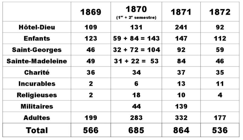 La Bresse est atteinte au cours de ce second semestre 1870 et la presse locale reprend un communiqué de l’Académie de médecine recommandant la revaccination [19]. L’épidémie frappe Bourg et les décès se multiplient à l’Hôtel-Dieu et dans les formations sanitaires, aménagées pour la guerre.
